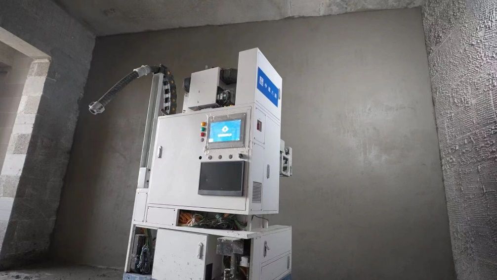 机器人抹灰的系统构成主要由分供料设备、送料管、抹灰机器人三大部分组成。机器人可根据设定的程序,自主移动,通过提前布放的定位激光线,进行现场调度与调整,实现机器抹灰。